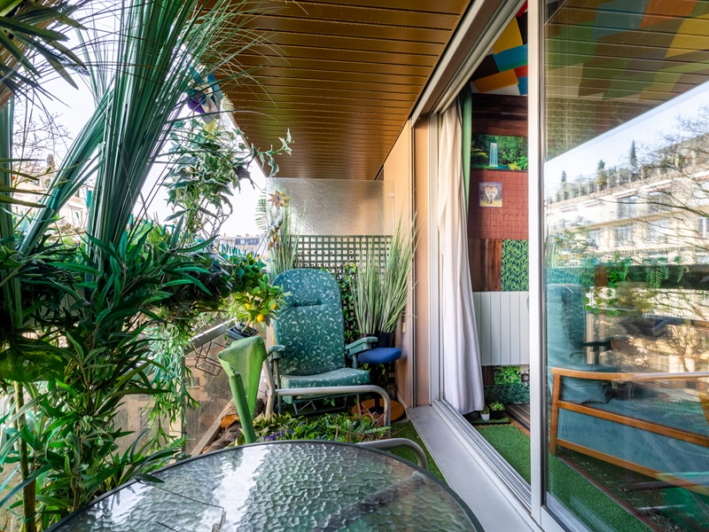L'appartement bénéficie d'une belle vue dégagée sur un grand jardin arboré sans vis-à-vis. Son grand balcon d'environ 4 m , dans le prolongement direct de la piéce principale, permet facilement d'installer une table pour déjeuner à deux et profiter du calme du jardin.